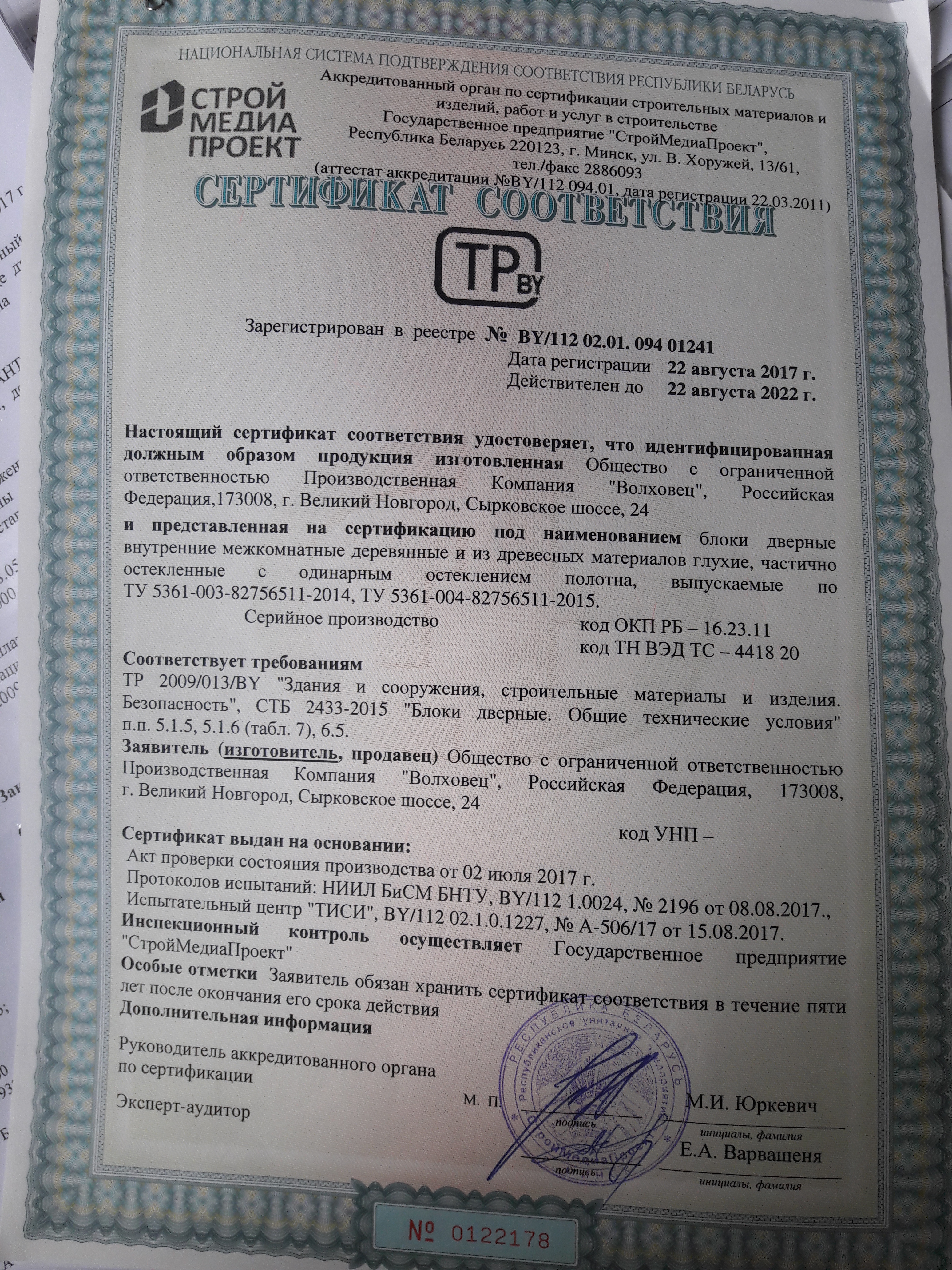 • Сертификат соответствия Двери межкомнатные и погонажные изделия в различных отделках и облицовочных материалах. До 14.03.2022